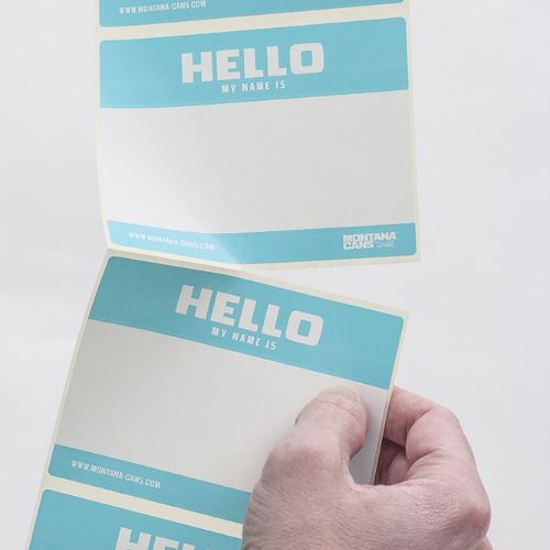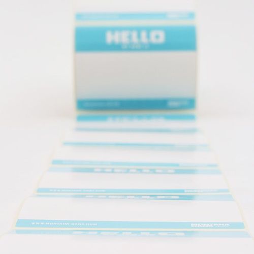 Nalepnica "hello my name is...", izrađena od presvučenog papirnog materijala, dolazi u roli od 500 komada. Rola je perforirana na svakih 4 nalepnice, što omogućava laku prodaju u manjim jedinicama. Dimenzije jedne Montana Hello my Name nalepnice su 12 cm x 9 cm.